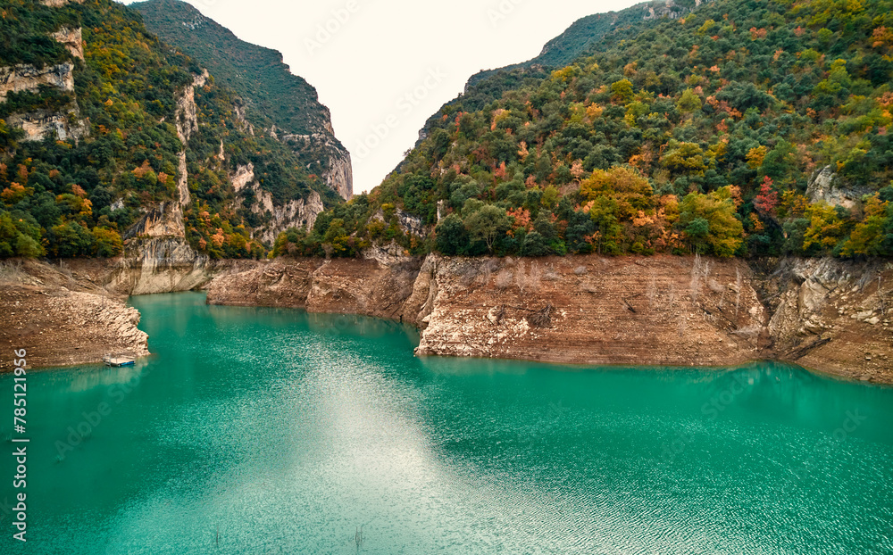 Lake nestled among mountains, surrounded by trees, viewed from above