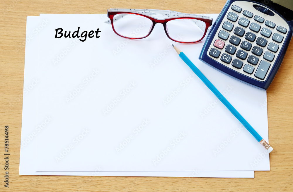 Budget word on paper with calculator and glasses background, fin