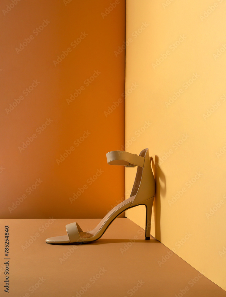 Minimal concept of women's beige sandal with a high heel placed in the corner. Sustainable fashion on yellow and brown background.