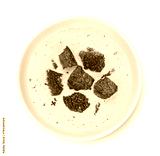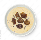 Meat goulash with cream sauce, beef stroganoff isolated on white background, top view
