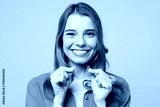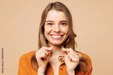 Young fun woman wear orange shirt casual clothes hold in hand invisible transparent aligners, invisalign bracer smile isolated on plain pastel light beige background studio portrait Lifestyle concept