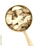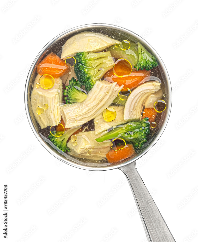 Ladle with chicken soup with vegetables isolated on white background, top view