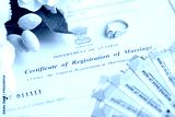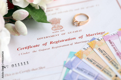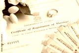 Indian Certificate of registration of marriage blank document and wedding ring with rupiah money on table close up