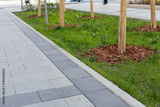 Landscaping of urban area. Mulching roots of trees growing on lawn of city park