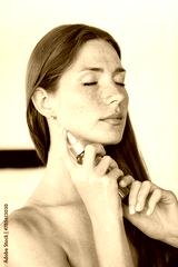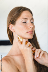 Vertical portrait of young Caucasian woman using body oil for skin indoors. Beautiful female lady girl applying serum SPF spray on neck and body. Skin care routine