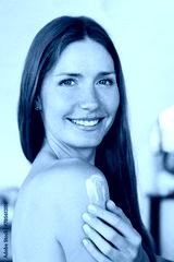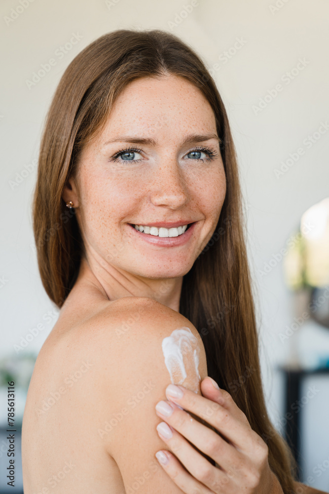 Vertical portrait of young Caucasian woman applying moisturizing cream on body at home. Beautiful lady female girl looking at the camera, taking care of her skin indoors