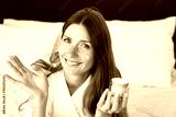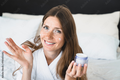 Closeup photo of young attractive woman in white spa bathrobe applying facial moisturizer on cheeks. Female looking at camera, using serum cream for anti-age effect