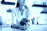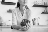 Cropped young Caucasian woman holding red bell pepper standing in the kitchen. Closeup image of girl housewife chef with healthy veganism vegetarianism way of living lifestyle
