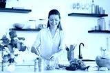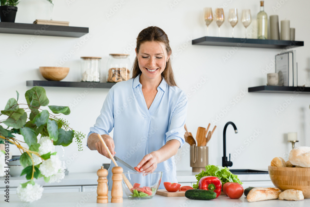 Happy young Caucasian woman cooking salad while cutting vegetables at home kitchen. Housewife chef preparing soup vegan vegetarian meal food, making dinner lunch