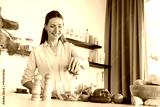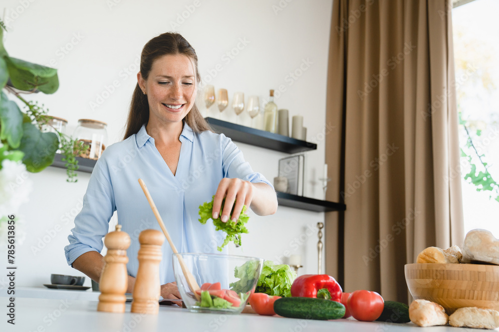Young female chef preparing vegetarian food, cutting vegetables at home kitchen. Woman housewife cooking dinner lunch indoors. Healthy eating habits concept