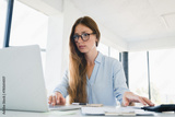Young Caucasian woman counting percent of budget using laptop and calculator at office desk. Female freelancer typing, preparing report, paying loan debt bills overdue