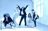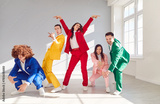 Group portrait of a team of happy dancers in colorful costumes, dancing together. Their joyful dance reflects the vibrant energy of the group, showcasing teamwork and love for dance.