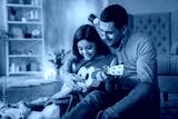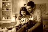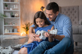 Cute little smiling girl playing on white wooden ukulele guitar with her smiling cheerful daddy dad father. Happy father teaching to play on ukulele guitar his daughter at cozy home