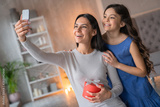 Happy cute girl congratulate her mother. Cheerful brunette caucasian woman with present on birthday from her daughter in her hands making selfie with her daughter. Happy mother's day!