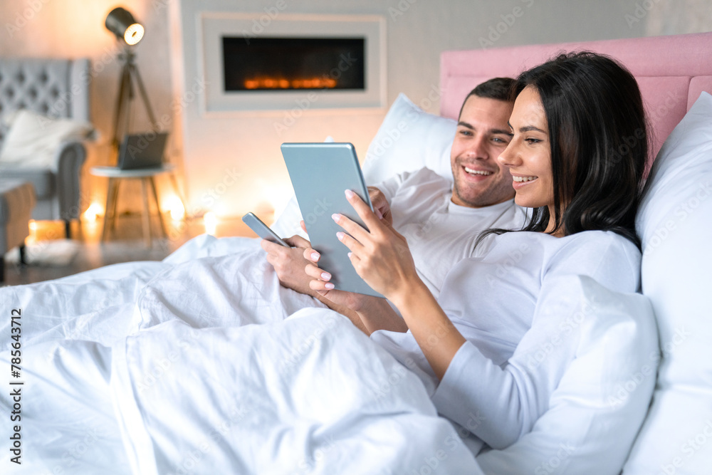 Smiling woman showing something in digital tablet pad to her husband. Positive man lying on bed with beautiful wife holding mobile phone in his hands. Young married couple using gadget before sleeping