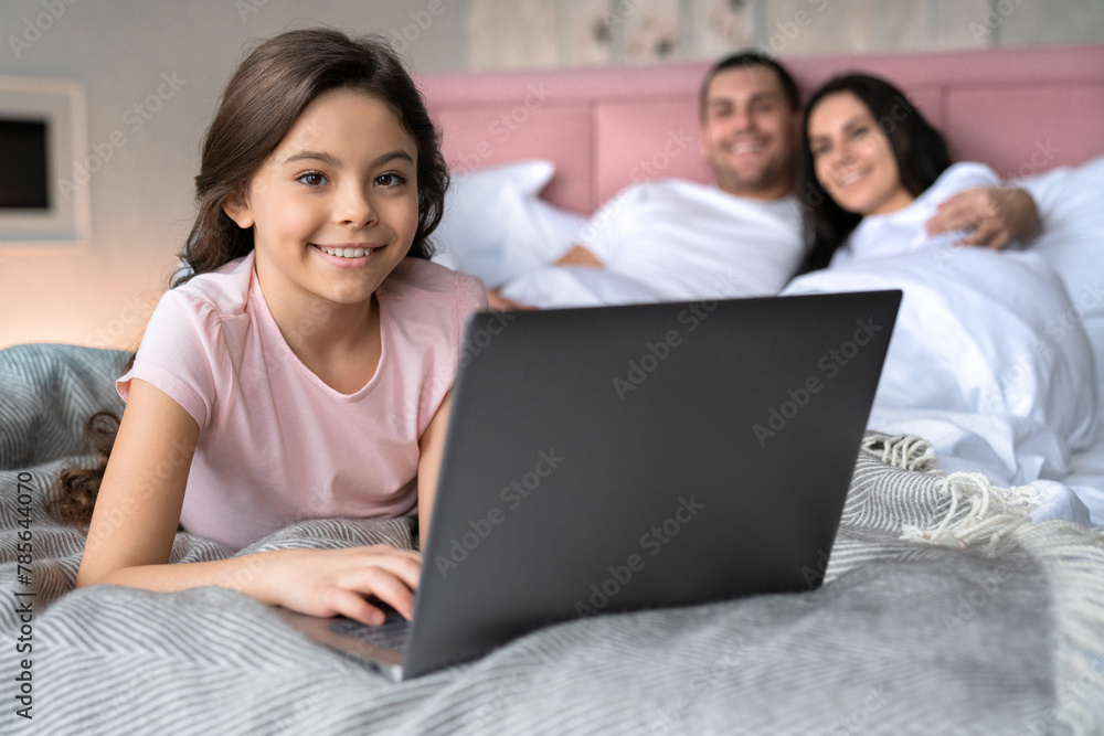Happy little preteen girl child kid lying on bed with open notebook laptop computer with look in camera. Happy parents couple man woman hug in the background, focus on girl.