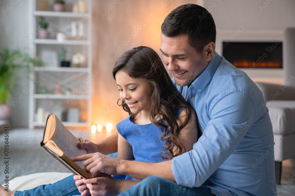 Horizontal shot of smiling young father that reading book story fair tail with his cute little preteen teenage daughter girl sitting on the floor carpet at home. Helping with home task
