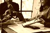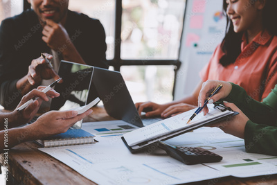 Financial analyst analyzes business finance reports on laptop and graph documents during corporate meeting discussions showing successful teamwork, business meeting ideas, marketing.