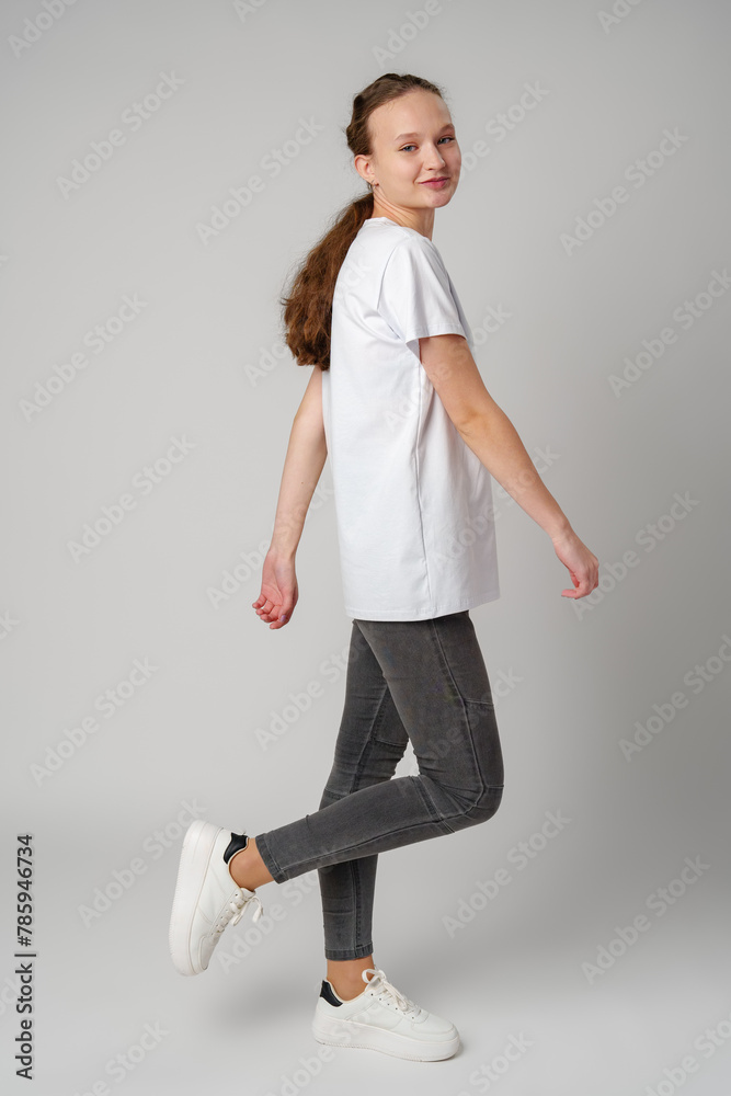 Beautiful young girl posing in white T-shirt and jeans on gray background