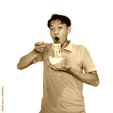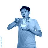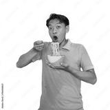 A portrait of a happy Asian man wearing a grey shirt while eating noodles. Isolated with a white background.