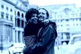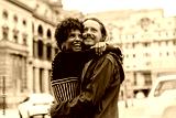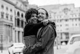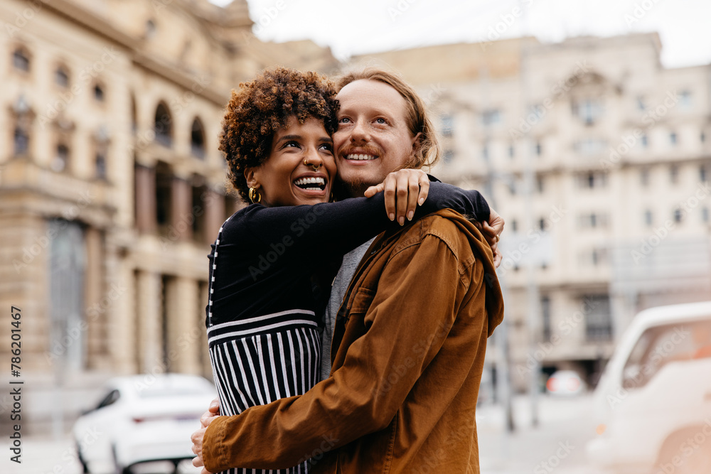 Embracing couple enjoying a romantic walk in the urban streets