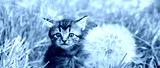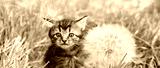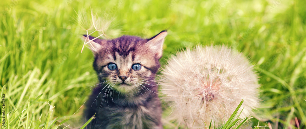 A cute little kitten sits on the lawn near a large dandelion clock. Horizontal banner