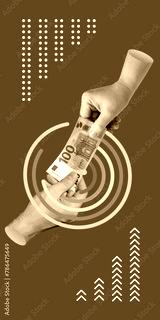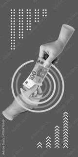 Payment for labor, services, and sale of goods. Donations, charity, business concept. Woman's hand passes 100 euro banknote to man's hand. Vertical minimalist art collage
