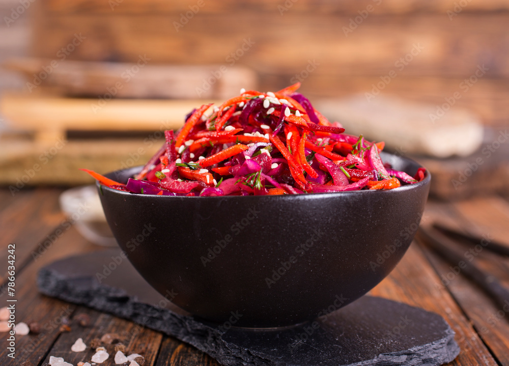 Fresh vegetable salad with sauerkraut cabbage, grated carrots and beetroots