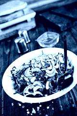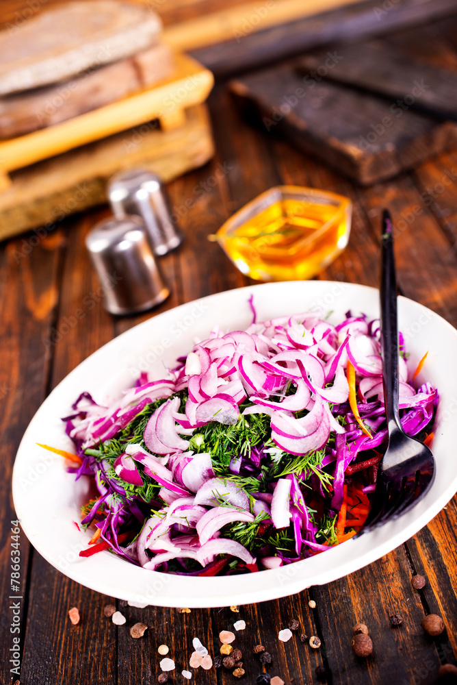 Fresh salad with onion, tomatoes and mixed greens on wooden background top view. Healthy food.