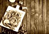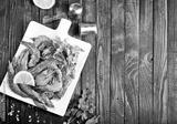 Uncooked Raw peeled tiger white shrimp prawn. wooden background.