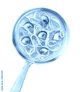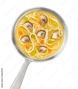 Ladle with instant noodle soup with mushrooms isolated on white background, top view