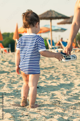 Woman hand giving flip flops to a toddler with sailor shirt on a