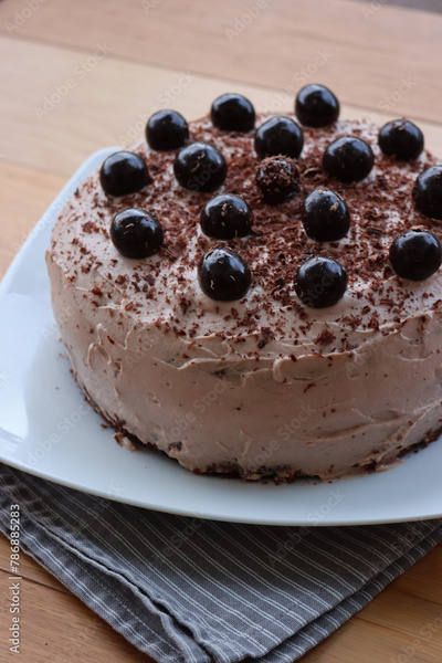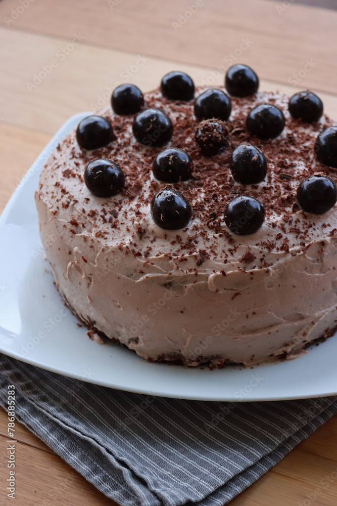 Close-up of whole chocolate cake with cocoa cream and sour cherries in syrup decoration on a white plate on wooden table