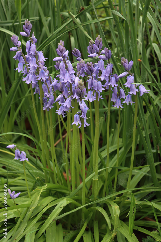 Many Bluebell flowers in the garden. Hyacinthoides non-scripta plants in bloom on a sunny day