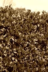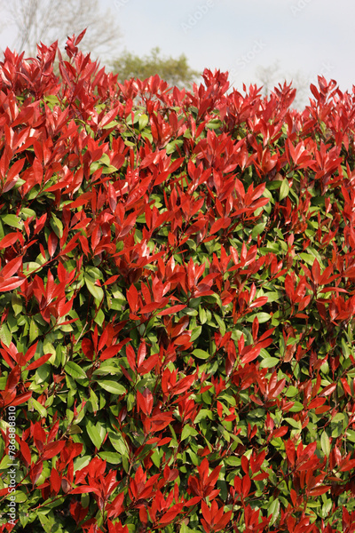 Close-up of Red Robin Photinia hedge with many red leaves on springtime. Photinia x fraseri in the garden