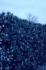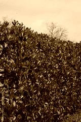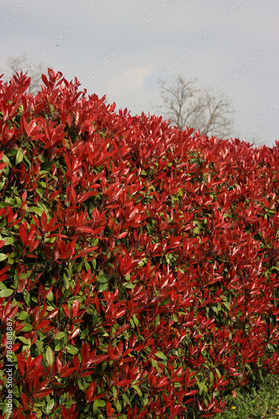 Red Robin Photinia hedge with many red leaves on springtime. Photinia x fraseri in the garden