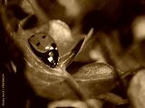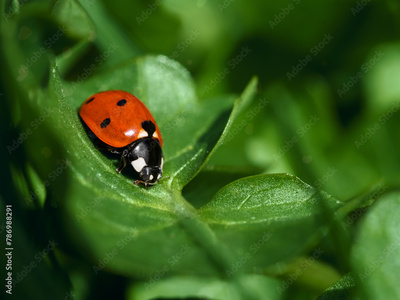 Ladybug sitting on a green leaf, macro