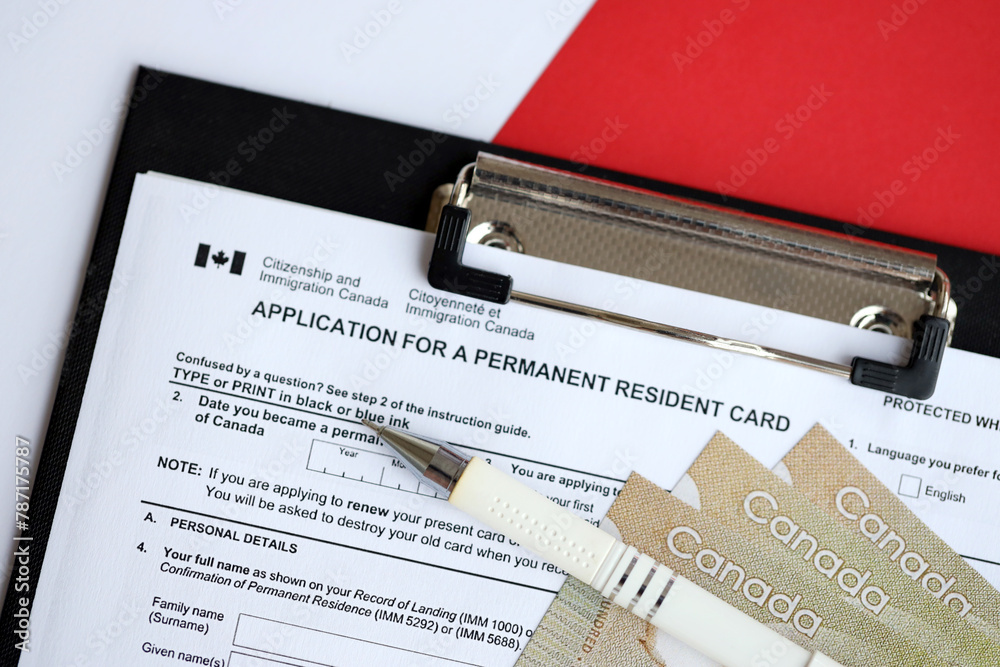 Application for permanent resident card on table with pen and canadian money close up