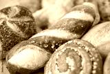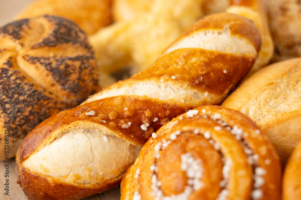 wicker basket overflowing with freshly baked pastries: cheese and poppy seed buns, pretzels, and sweet curd tarts