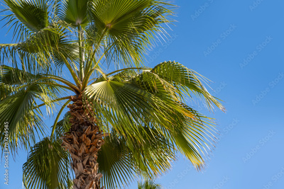 tropical leaf African Sabal fan palm gracefully sways on blue sky, natural beauty tropics, transcendence infinity tropical background, banner for travel agencies, hotels, airlines, food and beverages