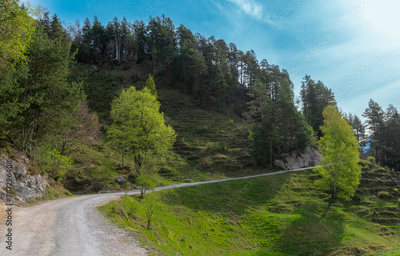 Scenic Mountain Path Through a Forested Hillside on a Clear Day (Kaiser Mountains, Austria)