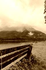 Bench at Hintersee with a View of the Surrounding Landscape and Low-Hanging Clouds