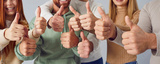 Close up portrait of a young people friends or group of students gathered together and putting their arms in a line showing thumb up sign. The concept of friendship, unity and teamwork. Banner.