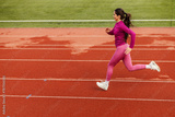 A fast sportswoman is sprinting at stadium.