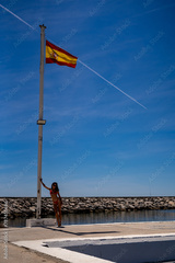 Stylish Brunette Woman in Black Sunglasses and Red Bikini Posing on a Rocky Seashore