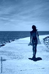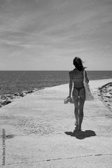 Stylish Brunette Woman in Black Sunglasses and Red Bikini Posing on a Rocky Seashore