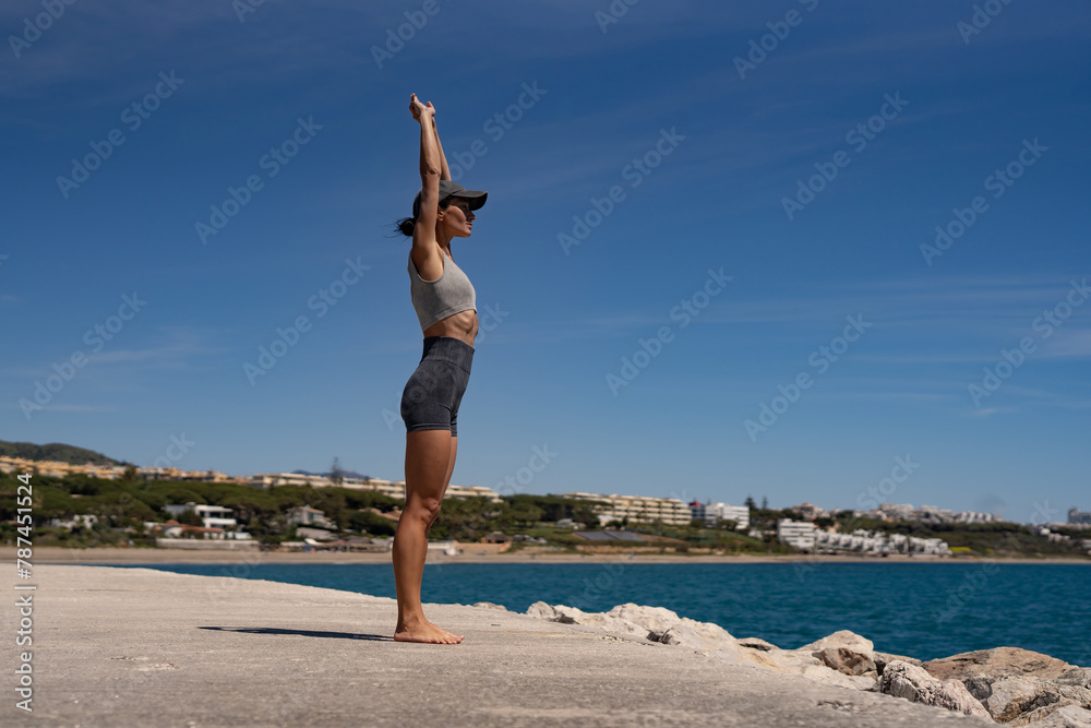 Sultry Brunette Athlete in Sportswear and Baseball Cap Training by the Sea