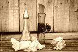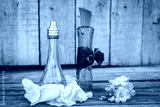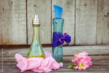 Blue and green perfume bottles near flowers fresia.