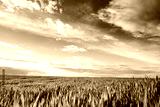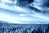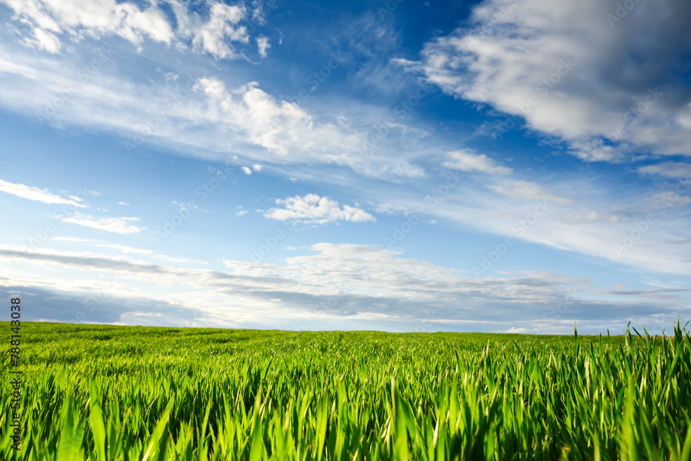 Young green wheat on spring agricultural field. Beautiful blue sky with clouds on background. Landscape photography