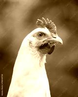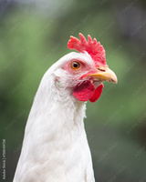 Portrait of free range white chicken leghorn breed in summer garden. Farm birds